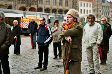Voluntary participant are asked to wait in a certain place in public space, for a certain lapse of time. Arranged in a geometric pattern, they are silently passed on to the hands of time. This permeable army formation provides a sharp contrast with the speed of life with which honderd of passers-by cross them.