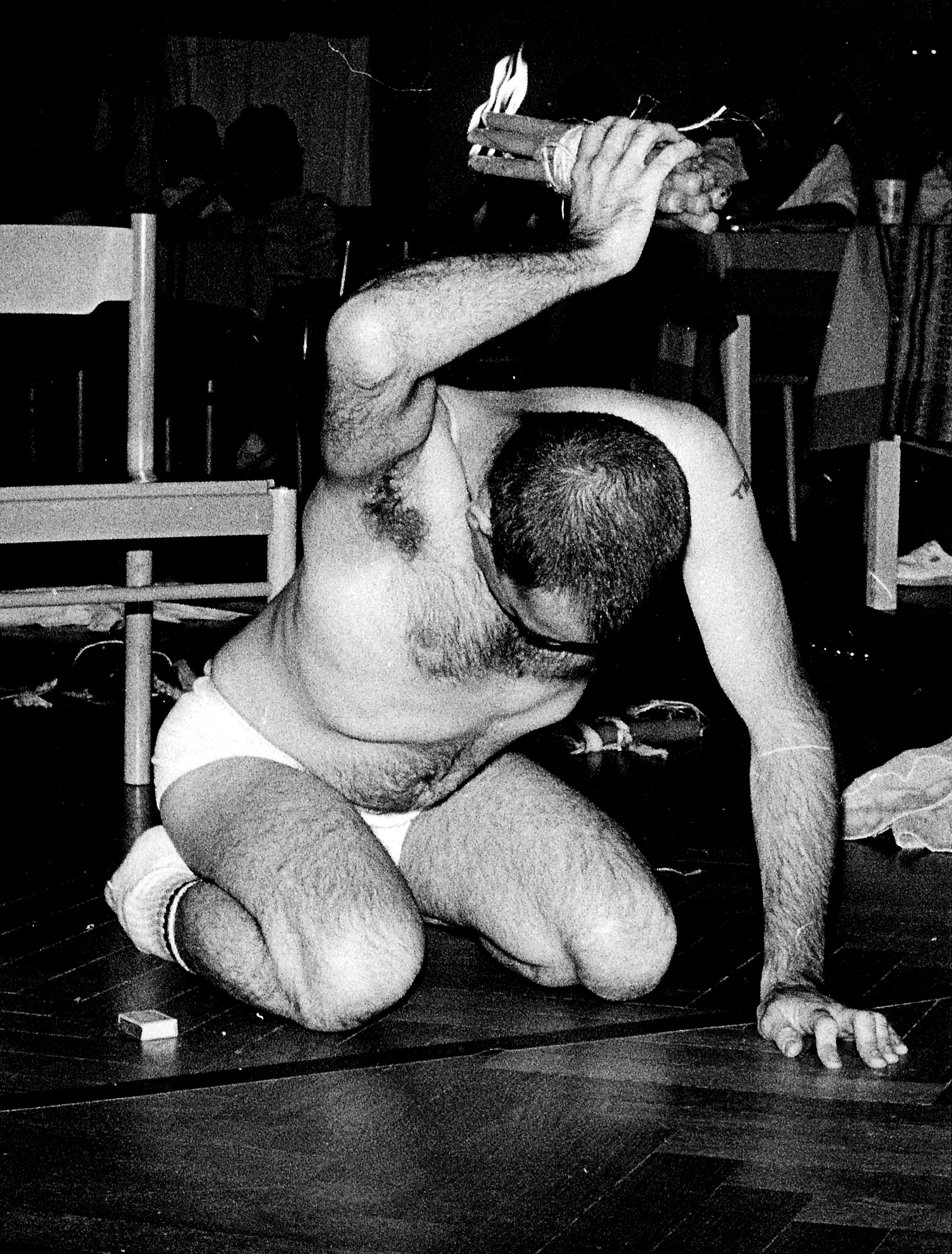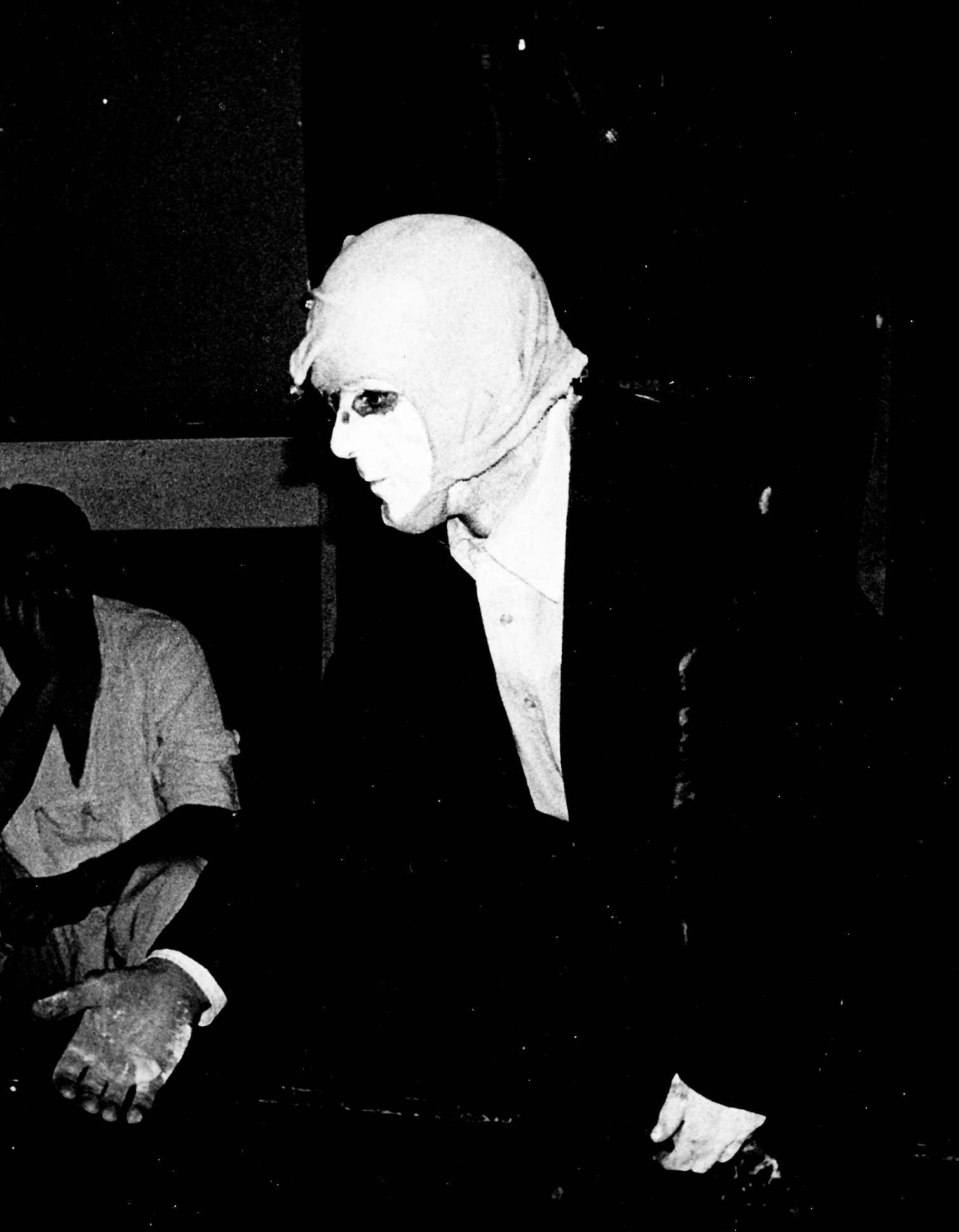 From the very beginning I can tell that the patients are completely absorbed. Aside from the catatonics in the room, the patients exhibit none of the behavioral reservations I normally see in audiences. They seem to be breathing with me, their muscles seem to tense and release when mine do and they seem to be discovering the same "story" which I am discovering as the piece unfolds within and around me. In only two or three other instances have I ever came anywhere close to experiencing such generosity from an audience. They give me far more than I give them - and I am giving them everything I have.