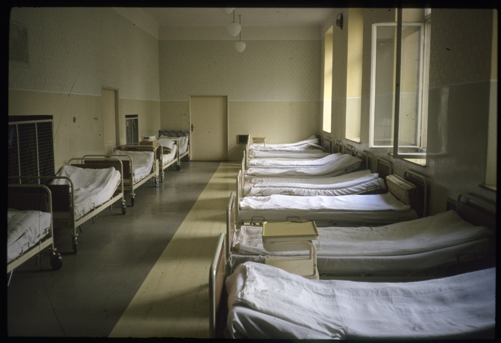 I insist on touring as much of the facility as possible, and so we spend hours going through most of the wards, dayrooms, dormitories, isolation cells etc. This hospital is the oldest and second largest in Czechoslovakia: 1500 patients, 20 doctors. Large early 19th-century buildings set in a vast fenced-in park, woods & gardens, long covered arcades, hedges, Baroque architecture; everything is straight out of Foucault.
