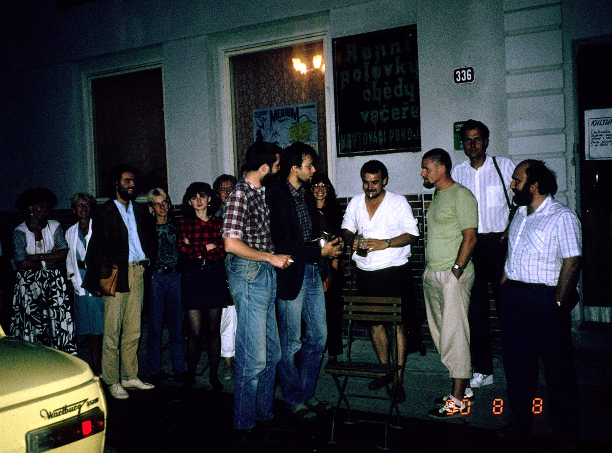 I exchange addresses with four patients. I'm repeatedly asked for my autograph - a physical artifact - and i am given artifacts in return: patients ran back to their wards to get and give me Civic Forum buttons, a Virgin Mary medallion, paintings and drawings they have made. The disco party disc jockey, also a patient, asks me if they can play music again. I say of course. He dedicates the first song, their favorite, to me. Michael Jackson's "Beat It." We end up dancing for two hours to Czech rock/disco music, all of us, patients, doctors, my friends from Plzeň. The patients are generous with their emotions. As with most populations with little to give, they give everything they have without reservation. At some point, after hours of dancing and talking, Franta tells me it is time to get going. I follow him outside the building and there it hits me - where I am - here is the tragedy and the price of this exceptional experience. I am leaving and so many of these people can't. We'd danced together but we can't walk any further together. I barely make it through hurried goodbyes and out through the big iron gates before I break down, sobbing convulsively, my face covered with my streaming tears. All my "normal" friends go to the pub down the road. I walk through fallow adjacent corn fields for half an hour before being able to join them.