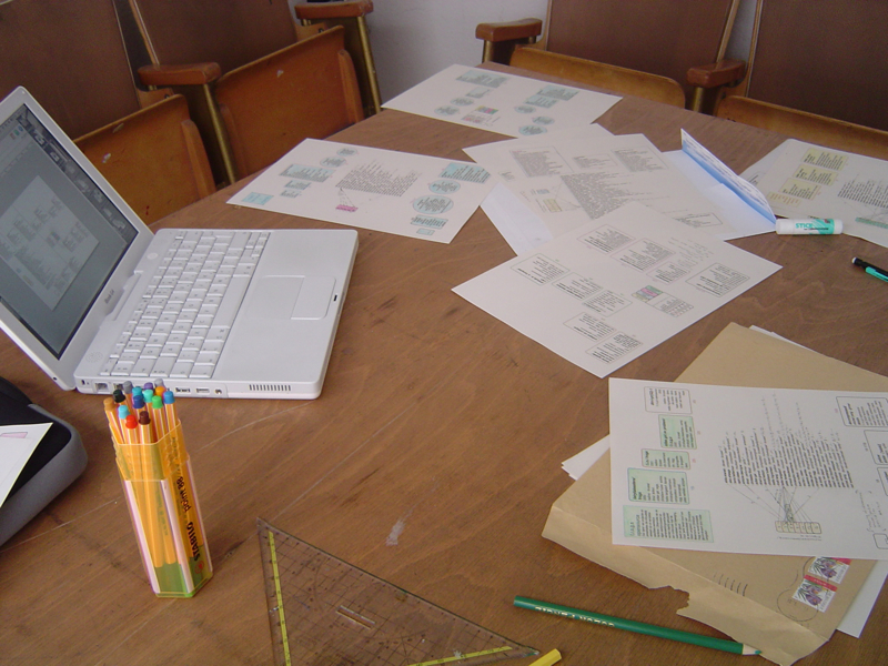 MAPS is a cartography by Heike Langsdorf dating from September 2004. Made on the occasion of the writing of a collective dossier for the Flemish Commission by Kunst/Werk, Sarma and f,r,o,g,s OS, the maps show all collaborative links within and between these three organizations, during the period of 2000 until 2004.
