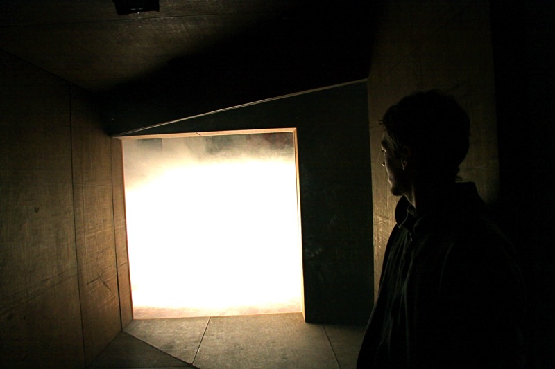 Technically the Viewmaster is a theater box with a double interchangeable interior room or 'stage'. By altering the light situation either one or the other stages or a superposition of both becomes visible. It uses non-digital techniques to produce a cinematic sequence of spaces rather then images. The glass wall acts as a window, mirror and projection screen. Using sound, lighting and image, the traditional set-up of theater and cinema is duplicated and questioned.
