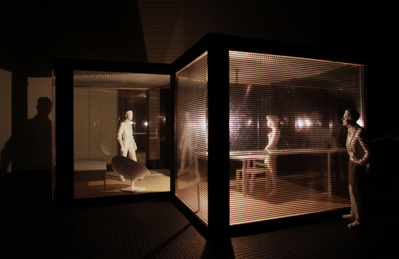 WoonMachine is a house in which dwelling happens without inhabitants. Somewhere between a modernistic glasshouse, and a theaterbox it investigates the borders between actual dwelling and the staging of it. In a choreography of sound, light and Venetians blinds it presents ‘a day in a life’ 35 minutes.