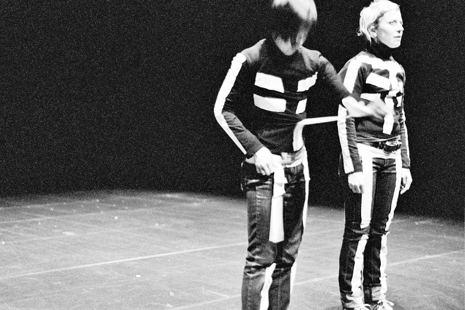 The prologue is not over yet. Some white presence is glowing in the dark. With the lights slowly raising, it becomes a set of lines, two figures, then two skeletons performing a mirror dance. It is a slow and contemplative dance, supported by a sound design that travels through time, evoking narratives of the ghostly, modernist music and science fiction. To end up front, lit and clear: we see two women (performers Lilia Mestre and Michel Yang) in black dresses, striped with white tape, which is taken off easily. Yes, we are in a theatre after all: what you see is nothing but histrionics – or? Still, the prologue has tuned us. It has invited us into a mirror dance with our own thoughts, travelling beyond the visual into an acoustic imaginary realm, guided by our ears.