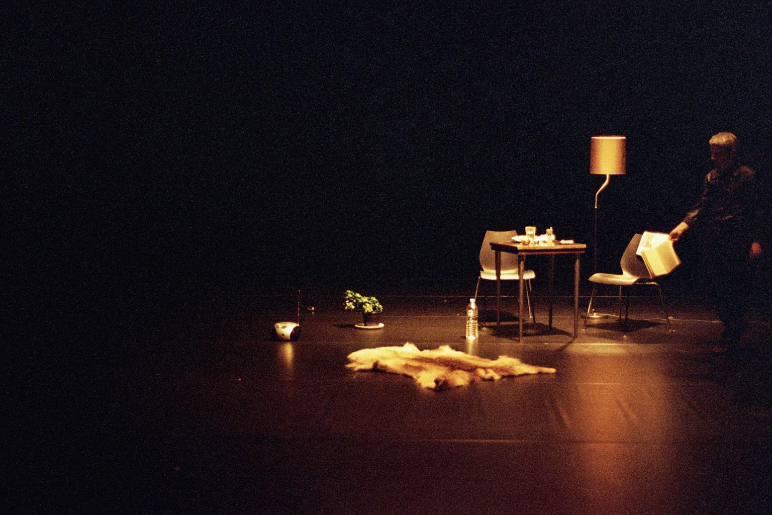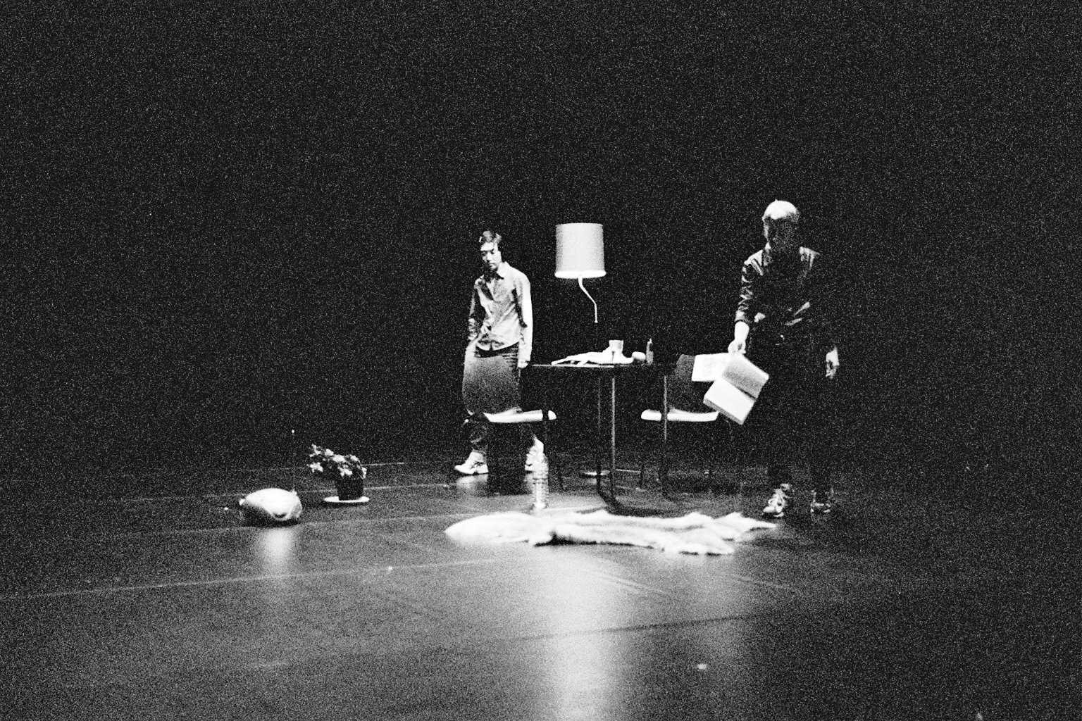 We follow visited bodies, silent though their lips move. They are moved by energy fields, struck with tics and twitchings – merely as hints, the movement material is not central to (g)hosts, which never moves into a demonology reminiscent of Meg Stuart. These bodies are hosts, they have pricked up their antennas like radio-receivers. A small radio is being installed on stage, the radio show continues and is open for people to call in. More voices enter the theatre. The two performers now construct a deserted living room around the radio, to then deconstruct it in slow motion – not unlike a decaying memento mori still life. The scene is moving in its evocation and detailed delivery, absurd in its reverse ghost busting. When Mestre eventually unplugs the radio, the mock character of the scene once again becomes clear – although the sound has long travelled elsewhere and though we knew from the start that it was a pre-recorded radio programme anyway. But again, this deconstruction of the machinery isn't exactly soothing, as the transformations one can track cover up myriads of other events, experiences and memories one hosts. Tuned in and scanning an alternative sensorial realm, we'll always be late to track down the ghostly, yet in a theatre with other people we are inevitably also ahead of ourselves. The sound reminds us of our heteronomous subjectivity.