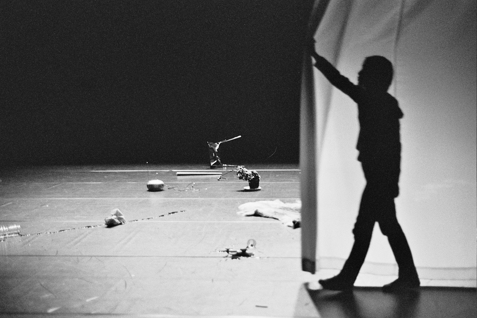 "How much myth do we build into our experience of time?" A white curtain is quivering and shimmering – yes, spooky, why not! (g)hosts spirals into the grotesque and is ready to celebrate it, propelled by lights and music one would expect at a party. Two masked clowns move jerkily in front of the curtain, ripping to pieces some major newspapers (such as Le Monde and the Financial Times) – strongholds and stakeholders of our all too humanist desire to have an encompassing and transparent view upon the world we live in. Myths, clotted and cluttered with our own desires. Yang takes off her clown mask, reminding us that we are still on air, finishes the show and makes us listen for a concluding 1'37" to Charles Bukowski – who happened to know wonderfully well where not to find himself. And then the theatre is plunged into blackness again.