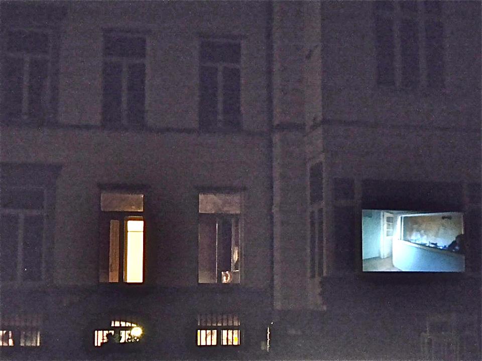 Back Again is a creation by bureau annex for April 2013, commisssioned by Les Halles / Trouble Festival: a choreographic slapstick-like scenario, which repeatedly was acted out in the same way on the same spot - the backspace of Taverne l'Evasion in Schaerbeek - by different actors, several times a day during one week. The different performances were filmed and successively edited and montaged towards a many-layered one-man-act. The actors could be observed from very close-by or from some distance, while taking a drink. After the act one could follow them towards a place in the direct neighborhood where the video-work they contributed to is being screened. Throughout the festival Trouble at Les Halles / Brussels, 3 times a day, another person enterd Taverne l'Evasion, spent there 10 minutes and then moved towards the Maison des Arts ... over there - 'in the videoimage' - these individual performances constituted one singular cloud: a swarm of individuals.