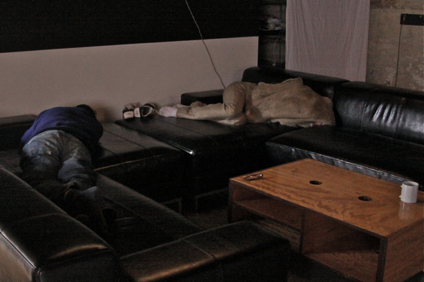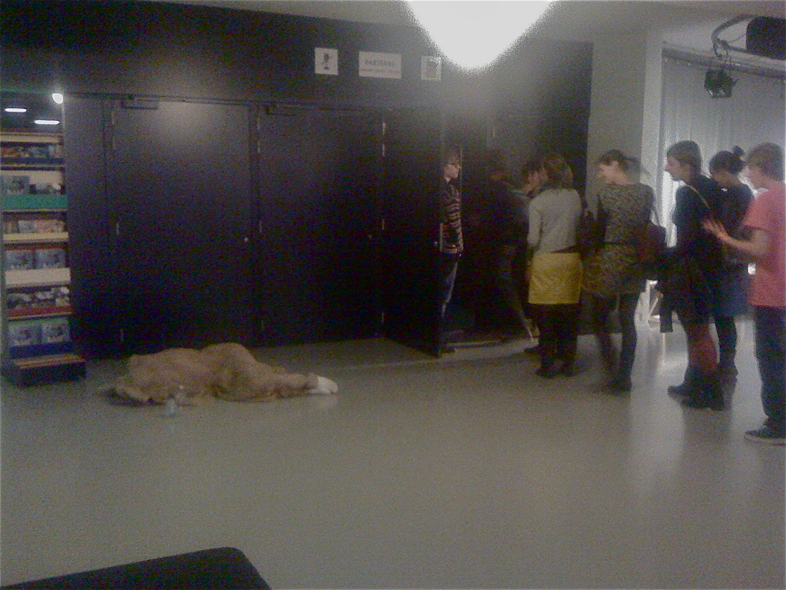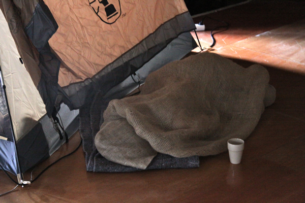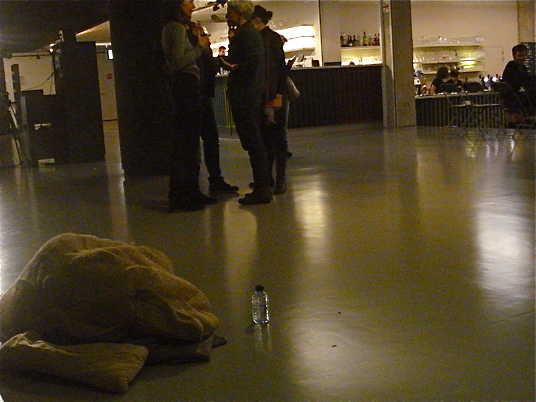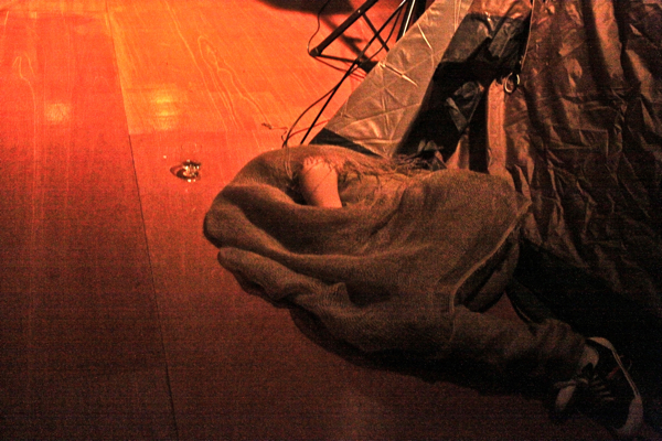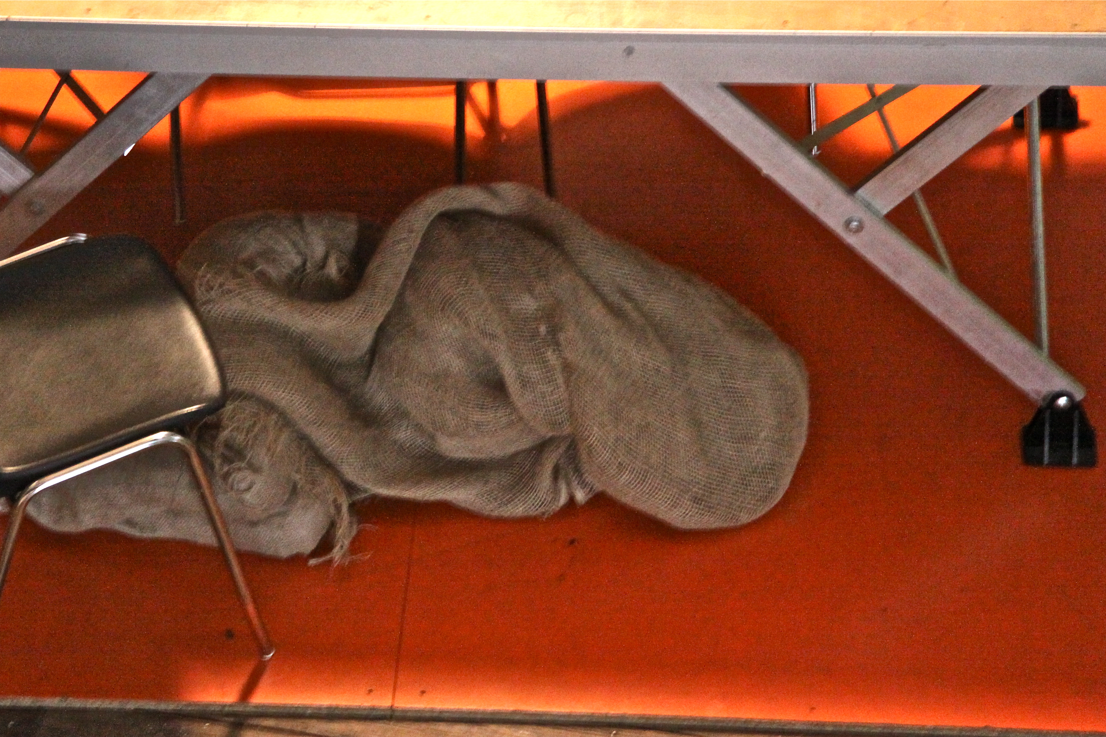 A performer commits him-/herself within a given public setting (festival lounge, shopping mall, public space, etc.) to dress in a bag-costume, lay down in a sleeping position and move as little as possible and for as long as possible. He/she waits for 'blind moments', during which an unrecognizable change of location can take place.