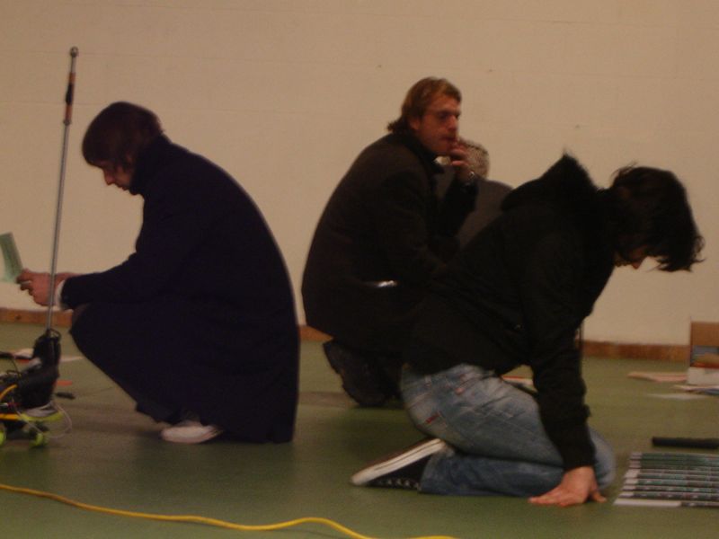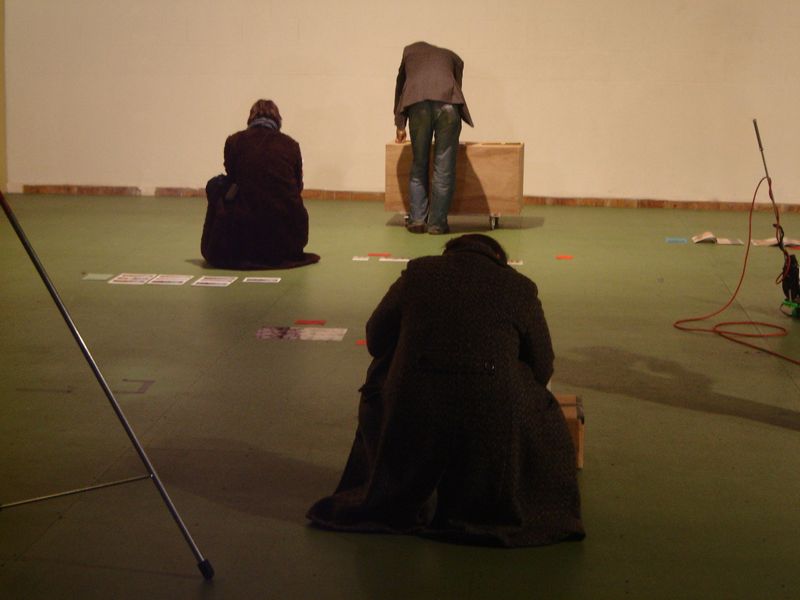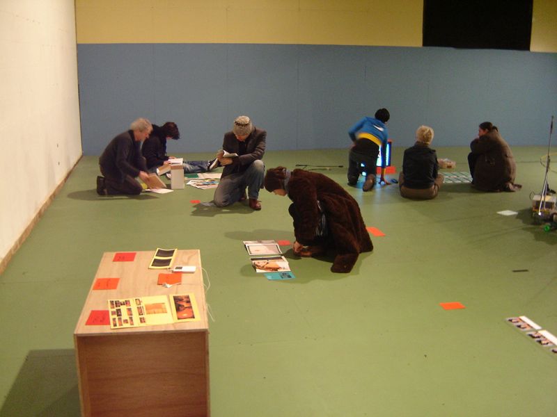 The presentation of before/yellow took the form of a 'live-mapping': An index box was emptied out and its content spread out on the studio floor of Netwerk, Aalst in order to communicate the working-process and its relevant stations to a public wandering amongst the printed, photographed and filmed material. A project-sketch called 'projectors/duet', a performance proposition for two dancers and two video projectors was also performed live.