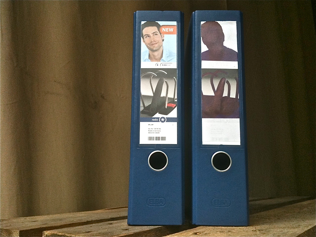 • blue keys / since 2011 : two ring binders collecting identical promotional flyers found in trains, planes etc. - one containing the originals, the other modified ('bic-arted') ones, to become a room-high collage one day.