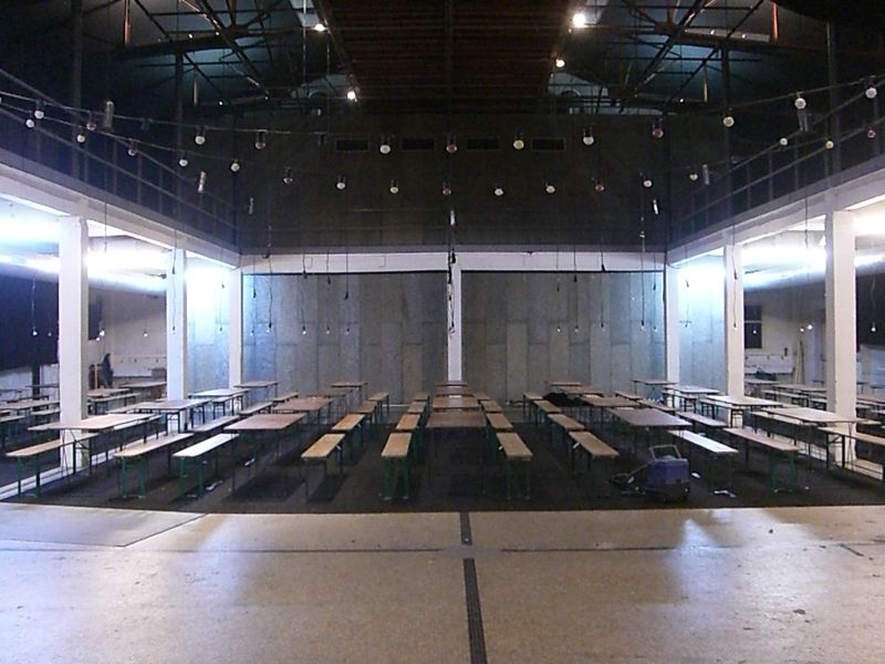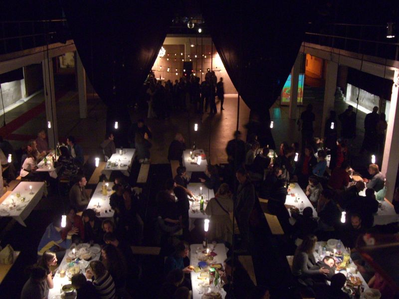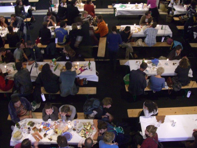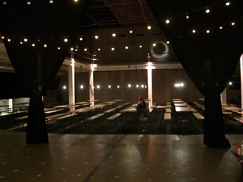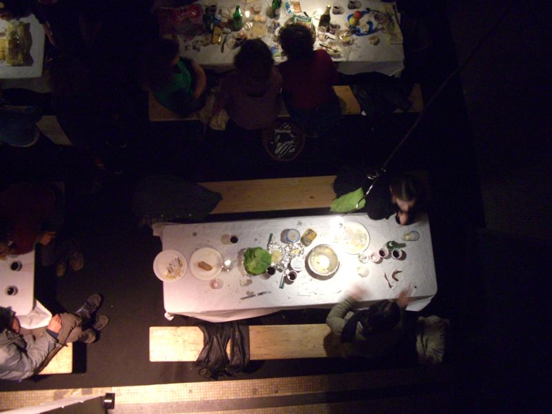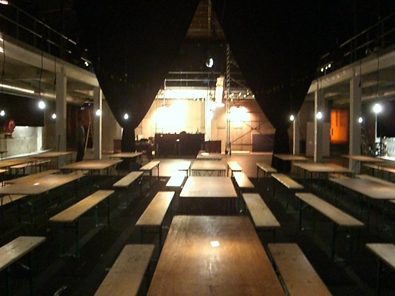 Starting from zero (an empty theater hall) until a climax ('the total restaurant' situation) and back to zero the evening passed though very different forms of eating-occasions : through the specific use of different light-sources, soundscapes and the architectural division of the space, the ongoing picnic and its different stages of construction and deconstruction, refer to the characteristics of the following locations: a construction site, a beer-tent, a sports-café, a romantic Italian Pizzeria, a luxurious-hotel-restaurant, a disco from the 80's, a dark dance hall and eventually the merging of a train-station and a (de)construction site.