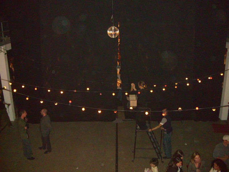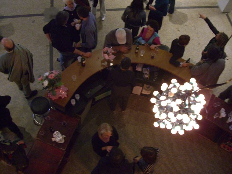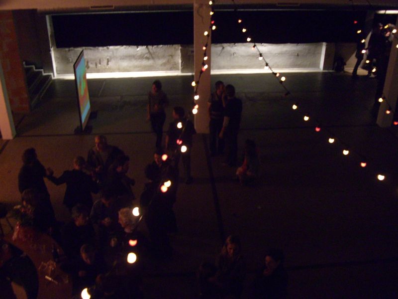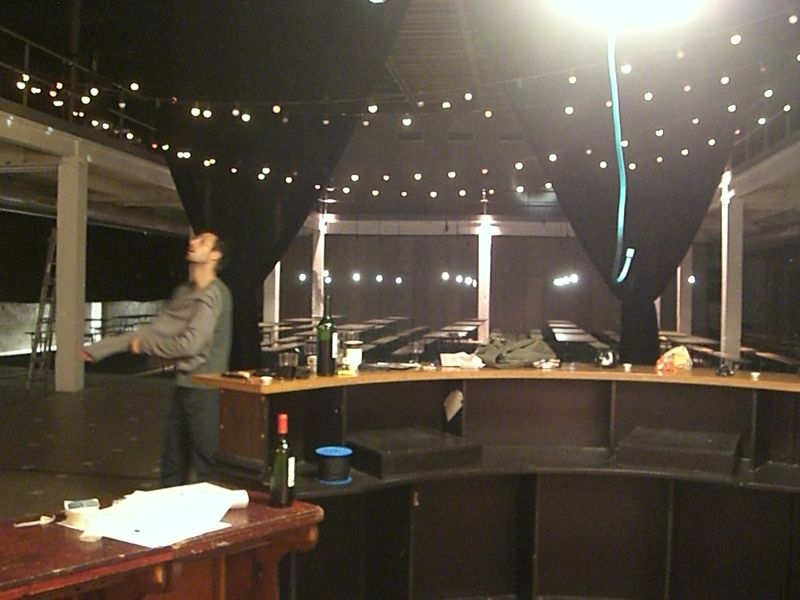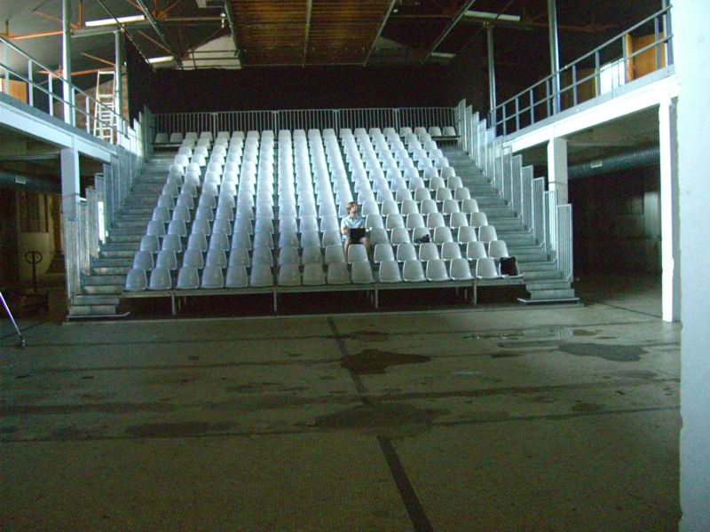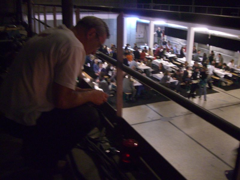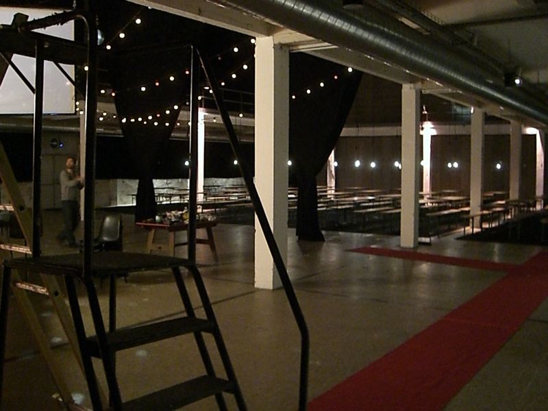 Starting from zero (an empty theater hall) until a climax ('the total restaurant' situation) and back to zero the evening passed though very different forms of eating-occasions : through the specific use of different light-sources, soundscapes and the architectural division of the space, the ongoing picnic and its different stages of construction and deconstruction, refer to the characteristics of the following locations: a construction site, a beer-tent, a sports-café, a romantic Italian Pizzeria, a luxurious-hotel-restaurant, a disco from the 80's, a dark dance hall and eventually the merging of a train-station and a (de)construction site.